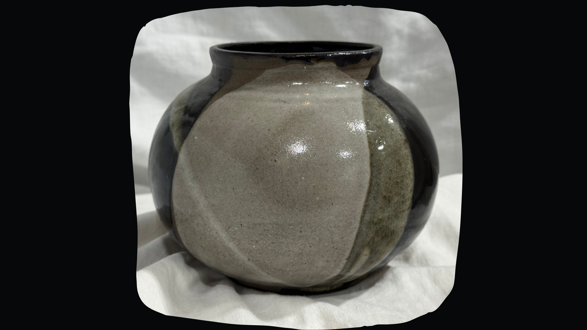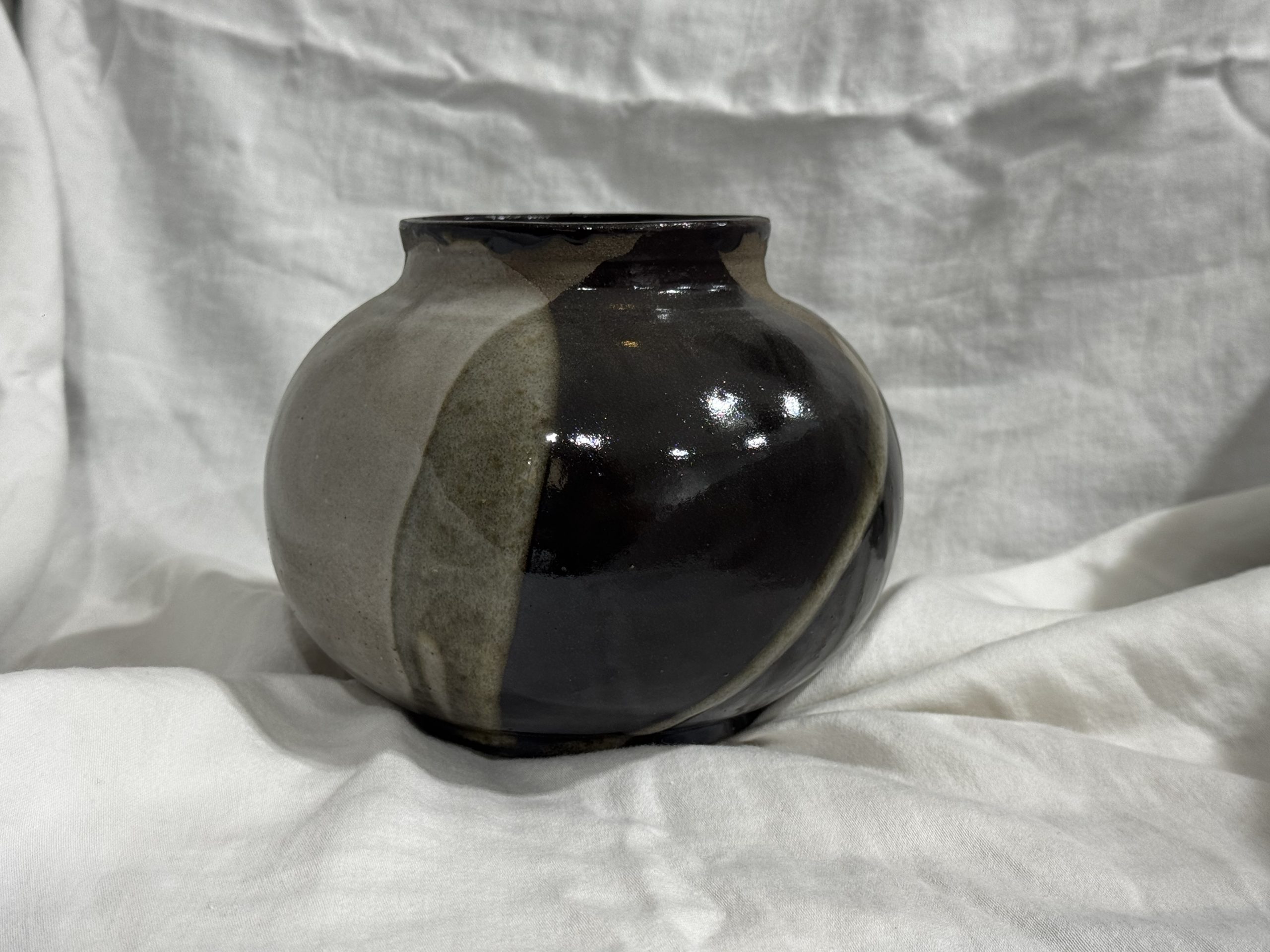 כד אסיאתי מסורתי, מזוגג בצבעים עזים שחור לבן ואפור על חימר חום כהה.